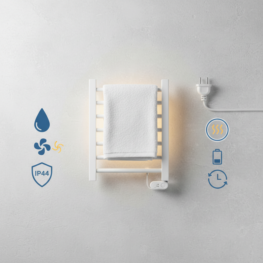 - Tik rankšluosčių džiovinimui: Jei jūsų vonioje jau yra grindinis šildymas ar kitas radiatorius, jums pakaks mažo galingumo elektrinio džiovintuvo. Tokiu atveju orientuokitės į 40–80 vatų (W) galingumą. Tokie prietaisai sunaudoja itin mažai elektros energijos (panašiai kaip sena kaitrinė lemputė) ir yra skirti tik tam, kad rankšluostis nebūtų drėgnas.