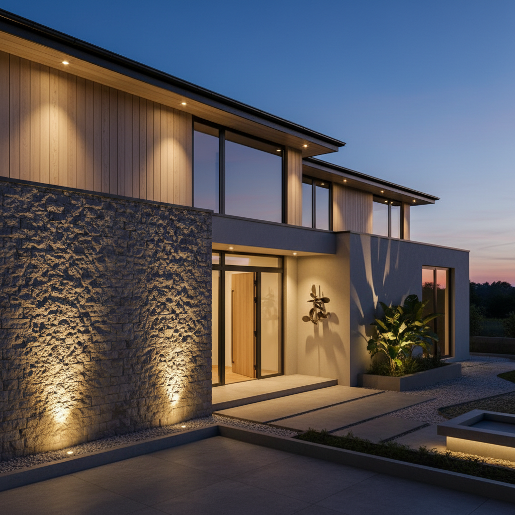 - Tolygus (skalbiamasis) apšvietimas: Plataus šviesos sklidimo kampo prožektoriai arba linijiniai fasadiniai šviestuvai apšviečia didelius, lygius pastato plotus. Tai vizualiai stipriai išplečia erdvę ir leidžia namui atrodyti kur kas didesniam, masyvesniam ir atviresniam.