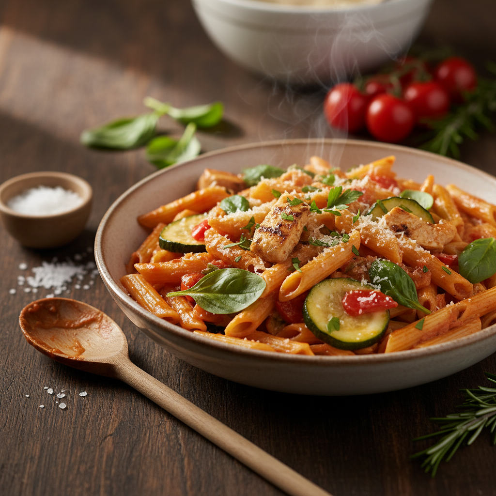 Šis patiekalas – tikra klasika. Pakanka keptuvėje lengvai apkepinti vištienos gabalėlius, pridėti mėgstamų daržovių (pavyzdžiui, cukinijų, paprikų, brokolių), įpilti sultinio, makaronų ir viską virti kartu. Pabaigoje galima įmaišyti šiek tiek tarkuoto sūrio ar grietinėlės. Rezultatas – kreminis, aromatingas patiekalas, kurį paruošite per 20–25 minutes.