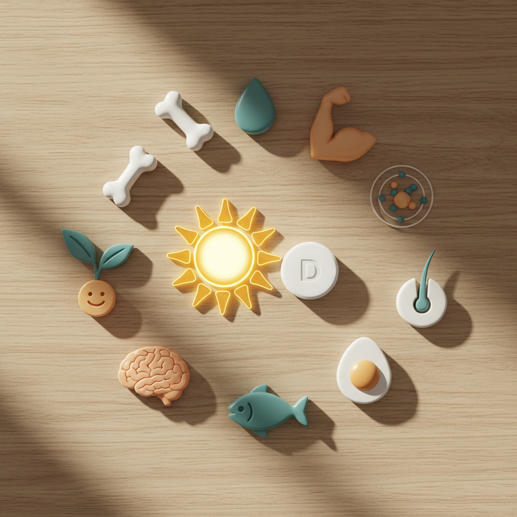 Vitaminas D yra riebaluose tirpus vitaminas, padedantis organizmui įsisavinti kalcį ir fosforą – du esminius mineralus, reikalingus stipriems kaulams ir dantims. Be to, jis turi įtakos daugybei biologinių procesų, tokių kaip hormonų pusiausvyra, imuninės sistemos atsakas, raumenų veikla ir nervų sistemos sveikata. Kai vitamino D trūksta, šie procesai ima veikti ne taip efektyviai.