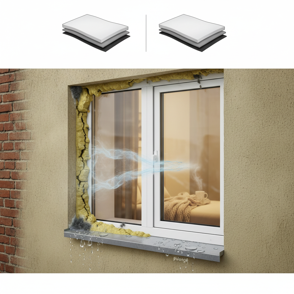 1. Vidinis sluoksnis (garų izoliacinė juosta): Ši juosta klijuojama iš patalpos vidaus. Jos pagrindinė funkcija – neleisti iš kambario sklindančiai drėgmei (atsirandančiai kvėpuojant, gaminant maistą, džiūstant rūbams) patekti į sandarinimo putas.